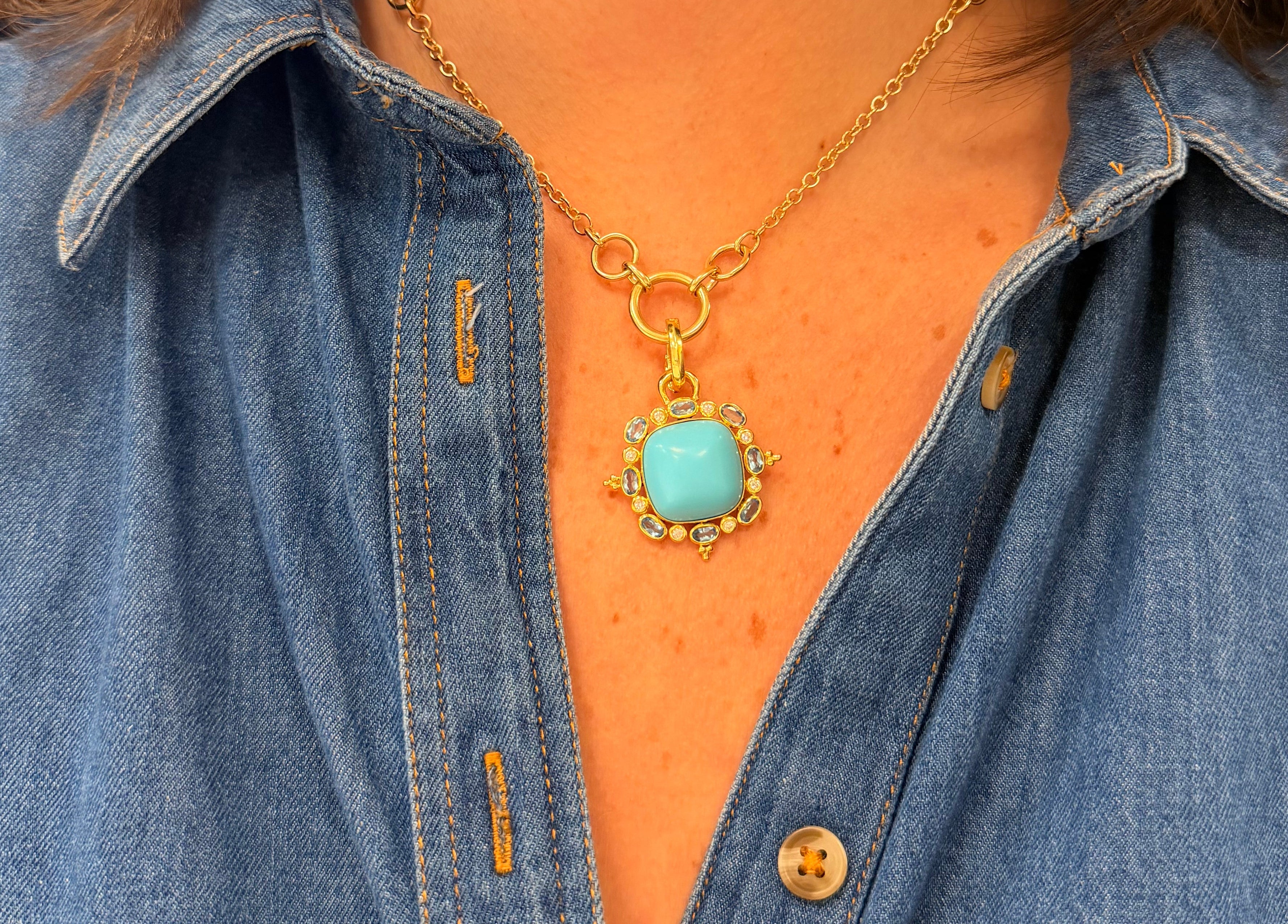 14K Yellow Gold Turquoise Pendant with Blue Topaz