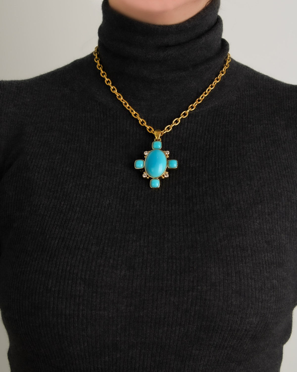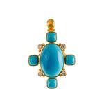 Vertical oval 20 x 28 mm Sleeping Beauty turquoise with four square 8 mm Sleeping Beauty turquoise and 3 x 5 mm round diamonds with gold dots on thin bezel brooch with fold-down detachable bale.