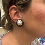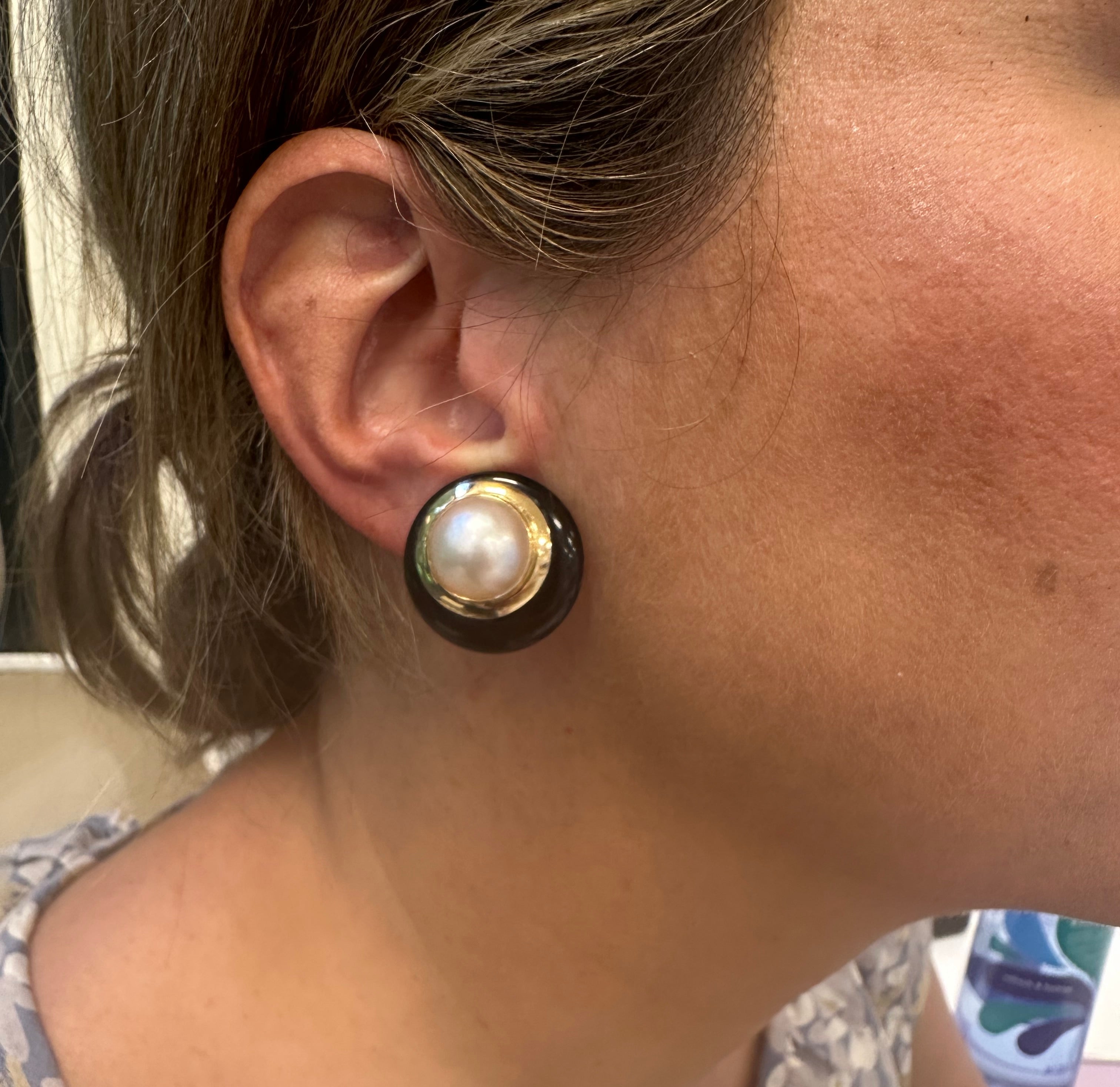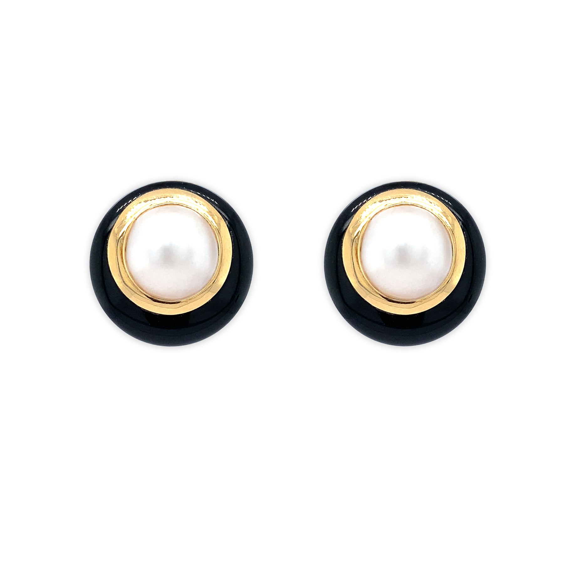 Estate Pearl and Onyx Yellow Gold Earrings
